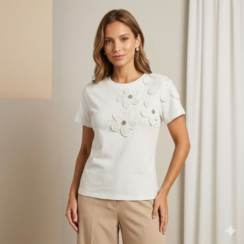 Remera de algodón con apliques de flores en crochet – delicada y femenina.