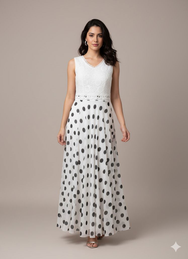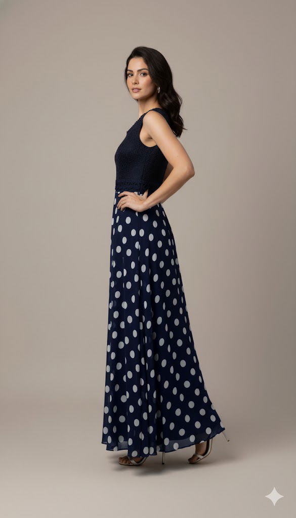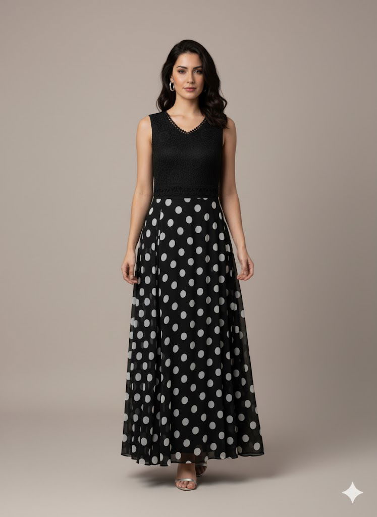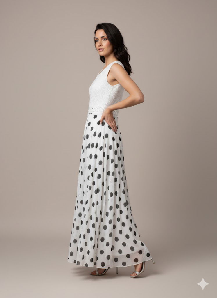Elegante y femenino, este vestido presenta parte superior de encaje delicado que aporta un toque sofisticado, combinada con una falda larga de gasa con estampa de lunares que brinda movimiento y ligereza. Está confeccionado con forro interno para mayor comodidad y mejor caída de la prenda. Cuenta además con cierre escondido, logrando un ajuste prolijo y discreto. Una prenda de muy buena calidad, ideal para ocasiones especiales.