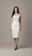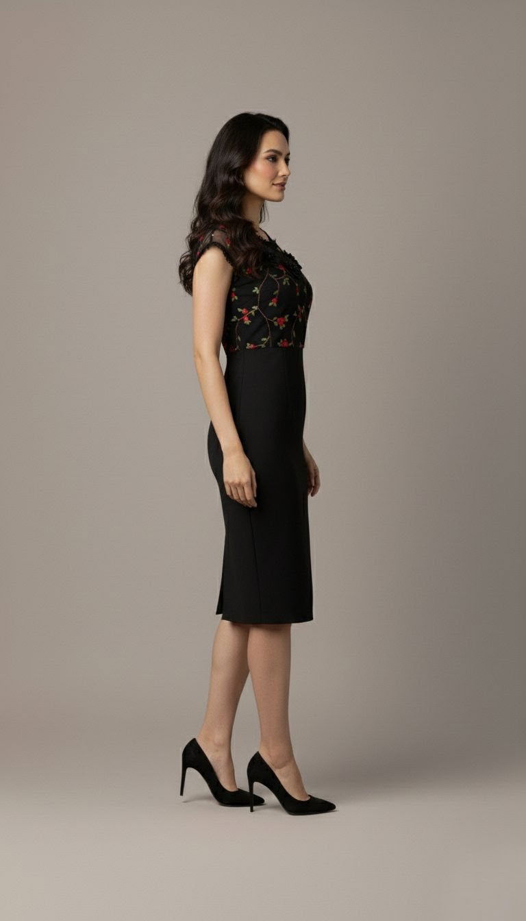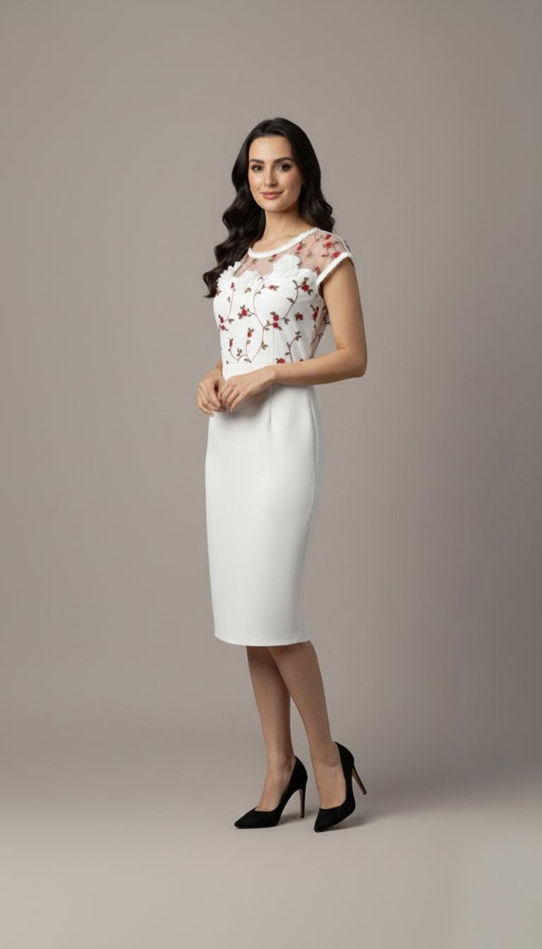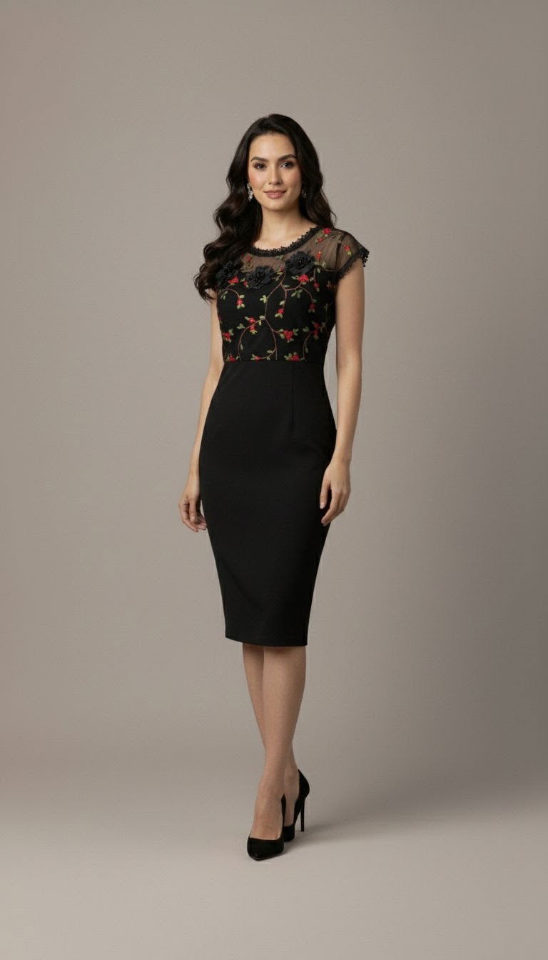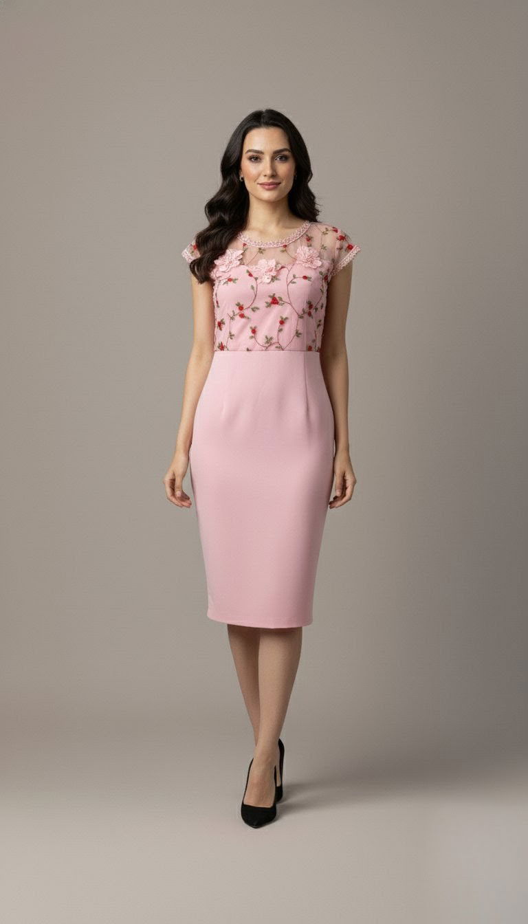 Diseño entallado que estiliza la figura, con falda recta y largo sobre la rodilla.