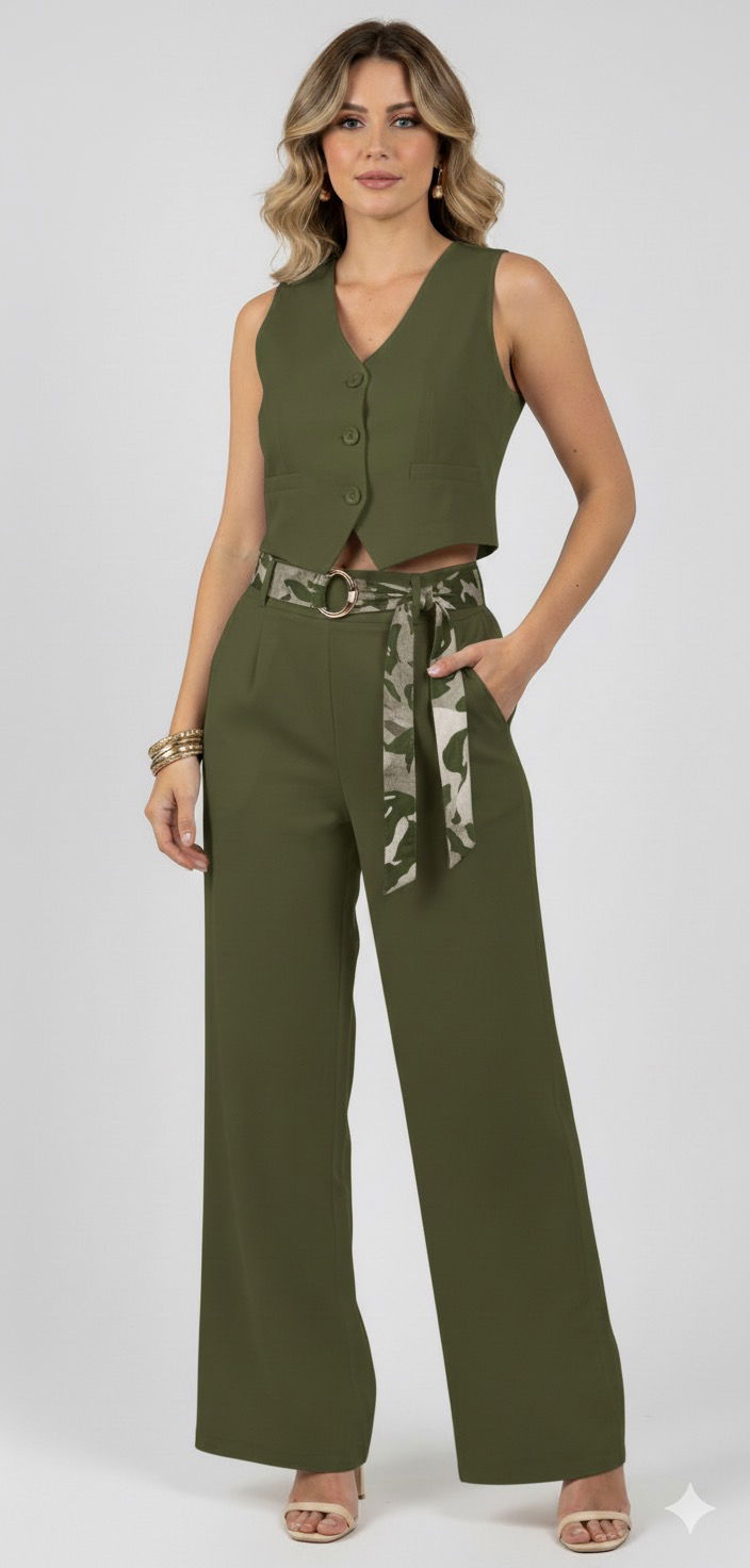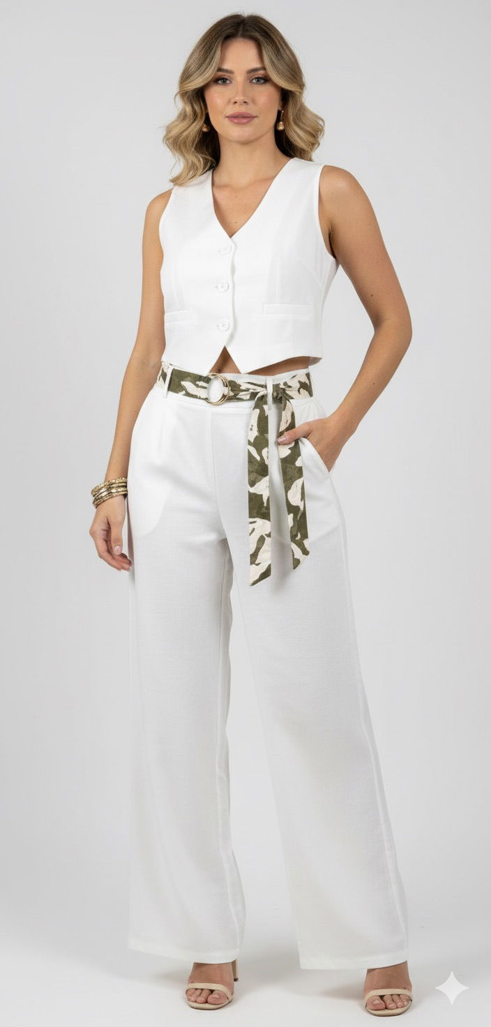 Este conjunto está confeccionado en lino de excelente calidad, liviano y fresco, ideal para climas cálidos. Incluye un chaleco de vestir que aporta estructura y elegancia, combinado con un pantalón palazo de caída amplia que estiliza la figura y brinda máximo confort.