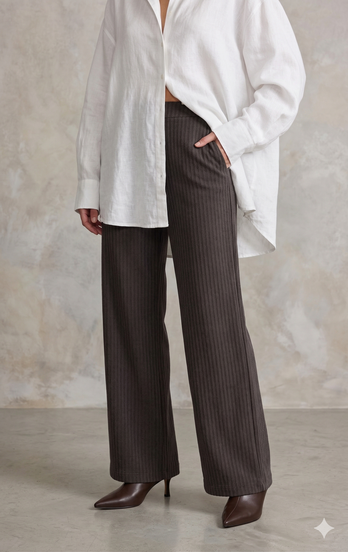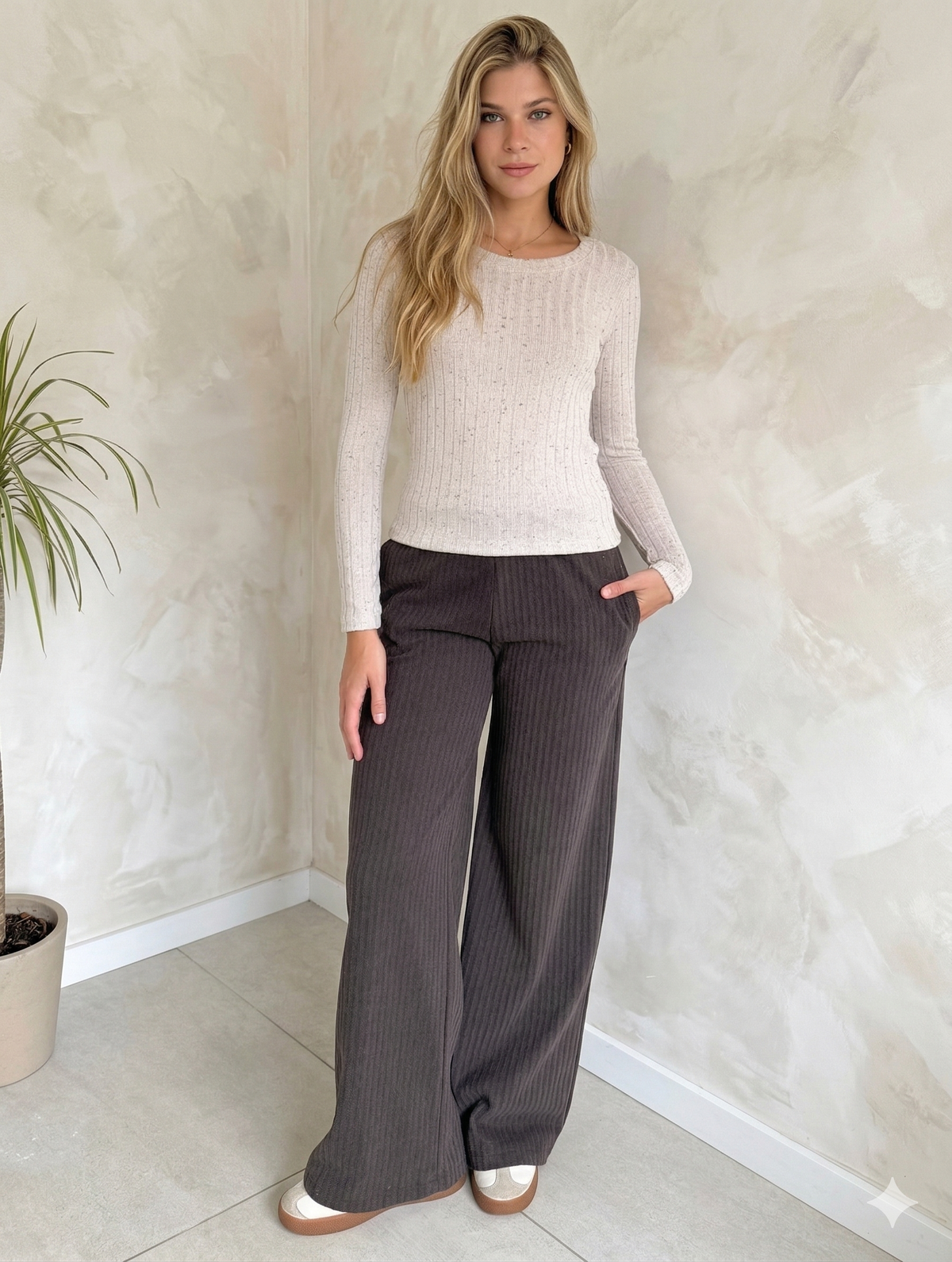 Pantalón palazo confeccionado en Darlon Spiga, una tela ideal para el frío por su textura abrigada, suave y con excelente caída. Su tiro alto define la cintura y estiliza la silueta, mientras que la pierna amplia aporta movimiento y comodidad.