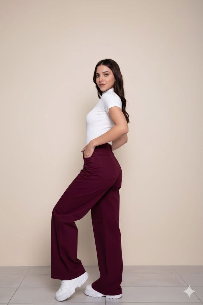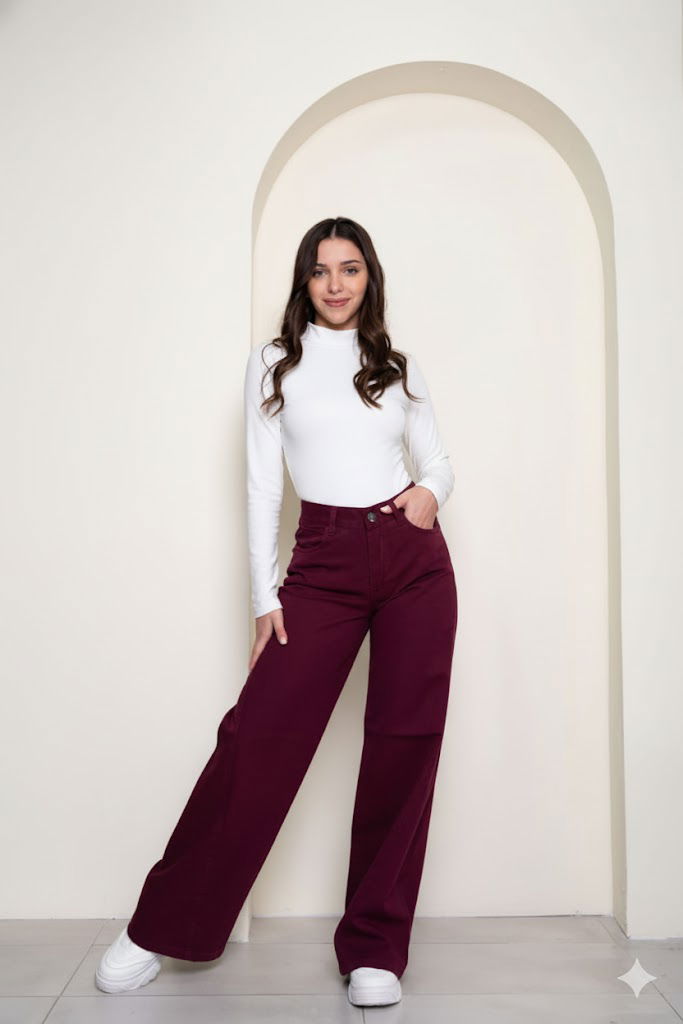 Jean pierna ancha bordó oscuro tiro alto – moderno y elegante.